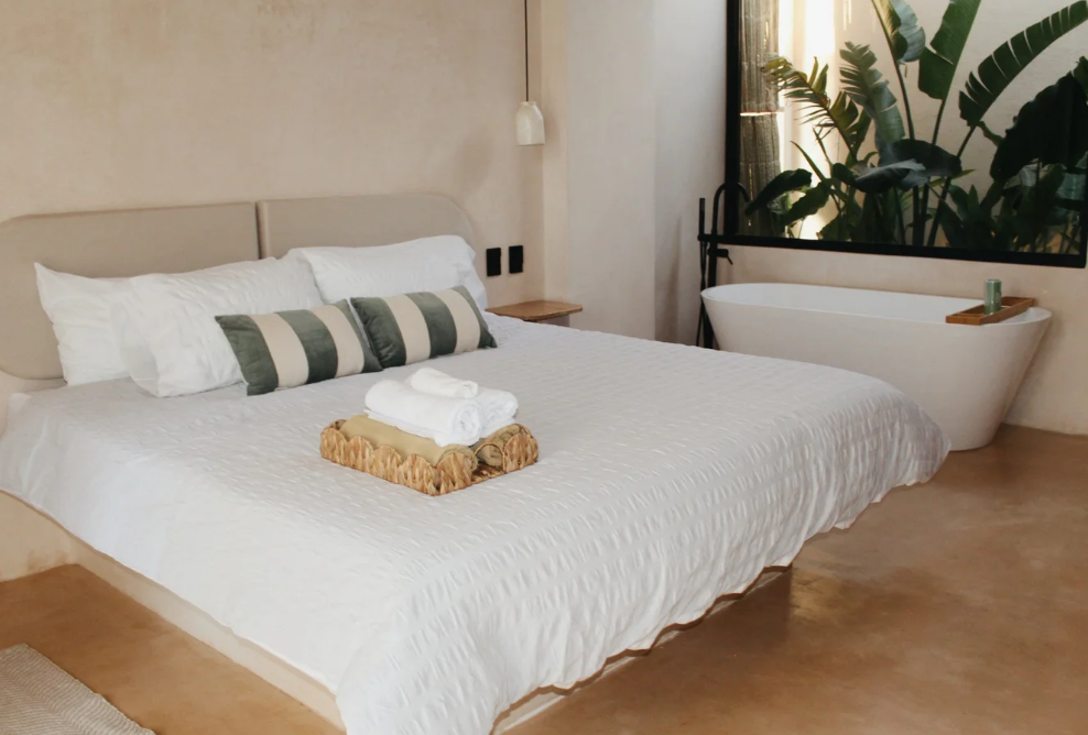 Stay at the beautiful Amaroo Palms Hotel- incredibly well-thought out rooms, friendly people and good vibes. Each “‘suite-style” room has a king size bed, private bathroom, and its own private kitchen. (Two people may share a room/bed)
